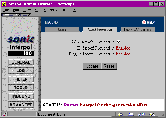 Because these holes are temporary, no in-bound packets will get through to the internal network unless they are an internal client's specific request. If you have a Web or mail server on the internal network, you can configure Interpol so that it will forward packets for specific TCP ports to specific hosts on the internal private network. However, this feature is limited to only a few predefined ports, so do not expect too much from it (although Sonic plans to expand this service in a future release).
