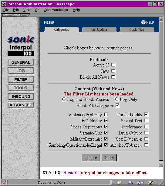 Another important component of the firewall is its embedded content filter. You can choose to block access to a variety of Internet sites by defining filters. Sonic Systems provides a free update service, so the firewall can automatically download new additions to a master list. And a local administer can easily supplement or modify the filtering system via any Java-based Web browser. You can also create user accounts that bypass the filters altogether.