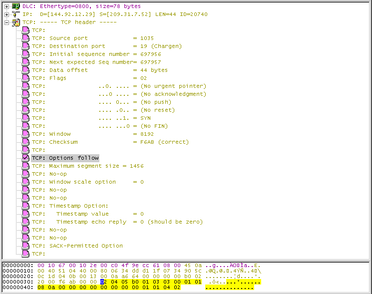 In the screen capture shown at right, you can see the first TCP segment sent from the Windows98 client. The first TCP option shown is the Maximum Segment Size (MSS); this well-known and widely used option is used for publishing the Maximum Transfer Unit (MTU) size of the local network (minus IP and TCP header data). Also scattered throughout the option space are No-Operation options, which are used to internally pad the option space. Neither the MSS or No-Op option are new—both appear in virtually every networked device on the planet. However, the remaining options are new to Windows98.