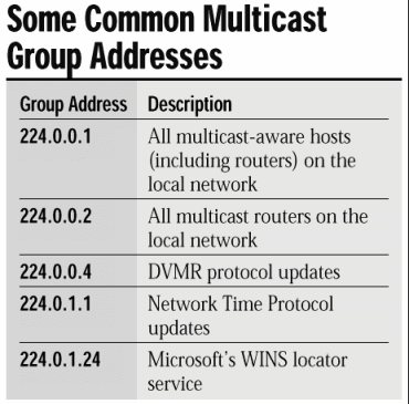 In the IP world, multicast group addresses are known as "Class D" addresses and include all IP addresses in the range of 224.0.0.0 through 239.255.255.255. A few of these addresses refer to specific, well-known applications (some are shown in the table at left). For a detailed list of all the registered multicast groups, see the Internet Assigned Numbers Authority's online registry at www.isi.edu/in-notes/iana/assignments/multicast-addresses.