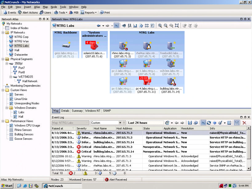 Upon start-up, NetCrunch presents a blank "atlas" of all known networks and nodes. We defined and ran a series of scans and probes to populate the atlas database and could see the resulting networks and nodes in dynamic "map" views set to our specifications.