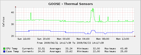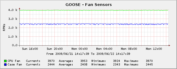 For illustration purposes, the graph in the figure at right shows the voltage sensors from one of my old SUSE Linux/Athlon servers: Additional graphs show two fan speed sensors, and two thermal sensors.