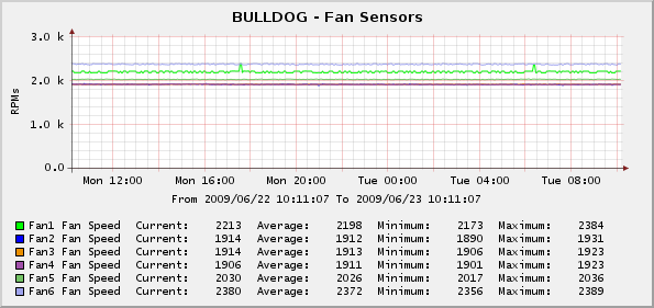 For illustration purposes, the graph in the figure at right shows six active fan sensors on a Supermicro PDSME+ motherboard running openSUSE with the SuperoDoctor II extensions. Additional graphs show two temperature sensors and eight voltage sensors.