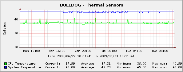 I try to monitor as many of the motherboard sensors as possible, since they often reveal a variety of hidden problems. Unfortunately, there is not a single universal source of motherboard sensor data available, so I have had to write multiple script templates that each pull sensor readings from device-specific sources, and then make them look and feel the same inside Cacti. This specific script template is for the SuperoDoctor package that is typically included with Supermicro motherboards, as exposed through an SNMP agent on the host operating system (either Net-SNMP on Linux, or Microsoft SNMP on Windows). I have tested this with SuperoDoctor III running on Windows Server 2003 and SuperoDoctor II on Linux, and both seem to work correctly.