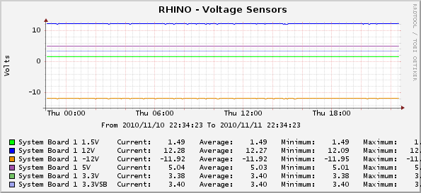 For illustration purposes, the graph in the figure at right shows the thermal sensor readings for a VMware ESXi 4.1 host with a Supermicro X6DHE-XG2 motherboard with two Xeon processors. Additional graphs from that same system show six fan speed sensors and six voltage sensors.