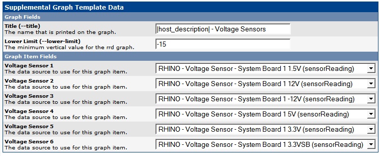The process described above will result in each sensor device having its own individual graph. The tarfile includes graph templates that can be used to pull readings from each of the individual data sources into a single graph, although some editing is required. To use these graph templates, perform the following steps: