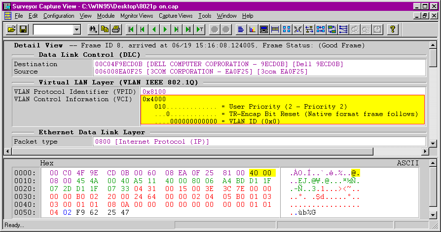 In particular, since the data is inserted before the 802.3 length field (or Ethernet II's ethertype field), any product that expects to see length or ethertype data at that location will not find it. Instead, it will see "8100," the new Tag Protocol Identifier field's default value for 802.1Q frames. Packet captures from Shomiti Systems' Surveyor network analyzer were able to decode 802.1Q data, but all the other decoders we tried displayed the frames as either "unknown ethertype" or "Wellfleet" (the latter used the 8100 ethertype at one time).