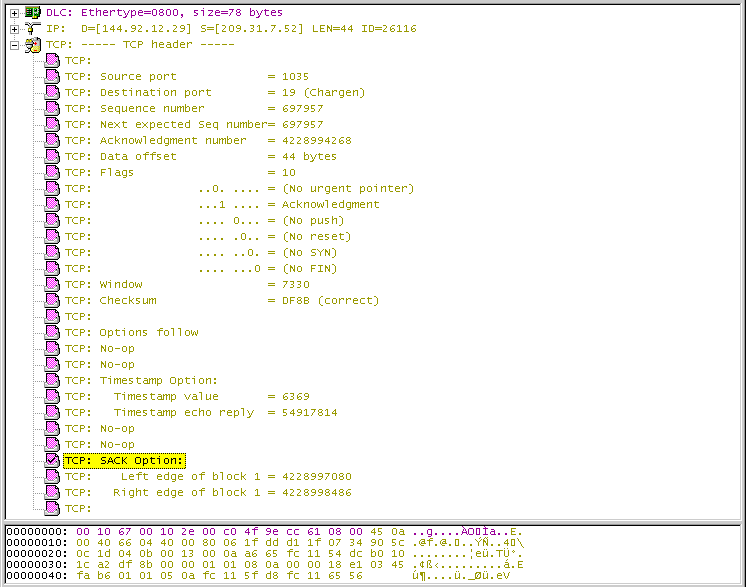 For example, in the screen below, you can see that the Windows98 client is still waiting for byte 4,228,994,268. But the Selective Acknowledgment option shows that the Windows98 client has also received bytes 4,228,997,080 through 4,228,998,486. Therefore, it is missing bytes 4,228,994,268 through 4,228,997,079, so the Solaris 7 host should only resend the missing 2,810 bytes, rather than restarting the entire transfer at byte number 4,228,994,268.