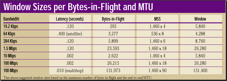 "Window Sizes per Bytes-in-Flight and MTU" shows some window sizes based on the maximum bits-in-flight and using some common segment sizes (shown here in bytes instead of bits). Notice that the 10-Mbps link with two milliseconds of latency is the only LAN configuration that is able to use a default setting of 4 x MSS. The rest of the configurations—particularly 100-Mbps Ethernet over a multihop network, which requires an MSS multiple of 90—would suffer serious performance limitations with this setting.
