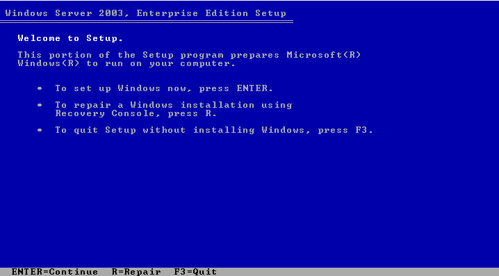 Now create the CD or ISO image file, and take the resultant product back to the test machine. You should be able to boot from the CD, and it should automatically start the setup process. Press "R" when prompted, and you should go into the Recovery Console (you can also press "F10" at the first screen to go directly into the console).