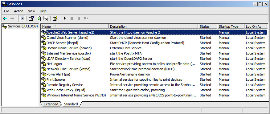 This works pretty well for letting you keep an eye on critical UNIX services, although there are a couple of rough spots in the behavior. For one, the service names and descriptions are not always accurate or complete, although this can be corrected by pointing regedit to the Samba server and modifying the entry names that way (these details are stored separately from the smb.conf boot data). Furthermore, the state of a service may not always be accurately reflected—as can be seen in the first screen shot, the "Status" field for the Apache2 service is null and empty, when the service has actually just been stopped.