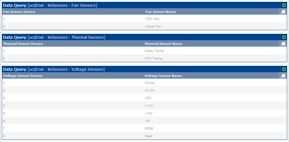 - Click on the Devices menu item on the left side of the Console screen, select a *NIX device that is running Net-SNMP and lmSensors, and scroll down to the "Associated Data Queries" table at the bottom of the screen. Select "ucd/net - lmSensors - Fan Sensors" in the "Add Data Query" drop-down box, and click the "Add" button. Repeat this step for the Thermal and Voltage data queries.