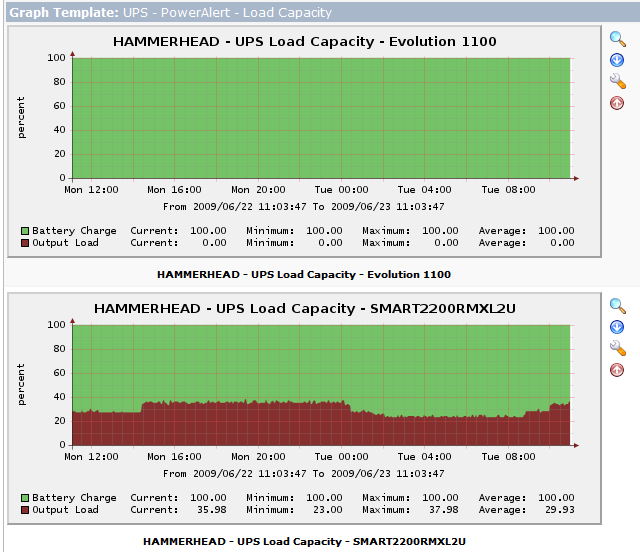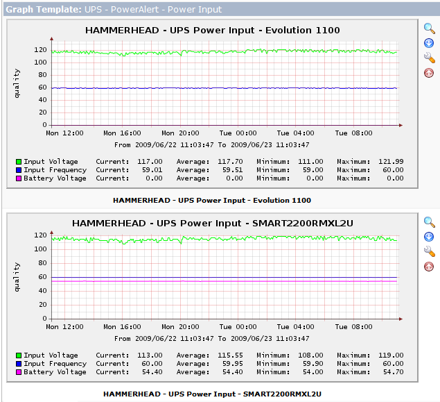 For illustration purposes, the graphs in the figures at right show the "Power Input" graphs for a Windows 2003 server running PowerAlert 12.04 communicating with an MGE Pulsar Evolution 1100 and a Tripp-Lite SMART2200RMXL2U via local USB interfaces, while the additional pair of graphs below show the "Load Capacity" output for the same two devices, and a separate graph shows the battery temperature for the Tripp-Lite UPS. I also use these same tools to monitor the same data on a variety of APC ES 650 and 750 UPS devices that serve the individual desktop systems. However, PowerAlert does not provide all of the data from all of the UPS devices—of the three UPS brands I have in use here, PowerAlert only displays the full set of data for the Tripp-Lite UPS.