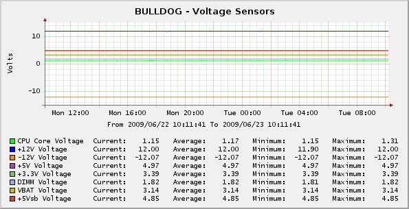 For illustration purposes, the graph in the figure at right shows six active fan sensors on a Supermicro PDSME+ motherboard running openSUSE with the SuperoDoctor II extensions. Additional graphs show two temperature sensors and eight voltage sensors.